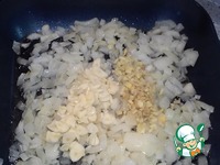 Выкладываем лук в сковороду, перемешиваем и жарим. Затем добавляем в сковороду с луком чеснок и имбирь. Перемешиваем и жарим, пока они не станут мягкими. |