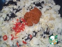 Добавляем томатное пюре, хорошо перемешиваем, пока не достигнем однородной массы. |