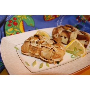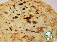 Возьмем два блина и нарежем каждый одинаковыми полосками. Один блин не трогаем, а полоски второго переплетем с первым. получится плетенный блин. |
