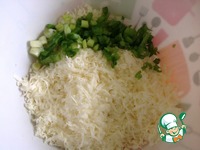 Сулугуни натереть на средней терке, лук мелко нашинковать |