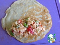 На готовый блин выложить начинку и свернуть блин в рулет. Блины можете брать свои любимые или использовать мой рецепт: http://www.povarenok .ru/recipes/show/102 699/?direct=1 |