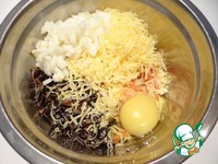 В миске соединяю кубики лосося, мелко нарезанный репчатый лук, яйцо, рис, натертый сыр, соль по вкусу. |