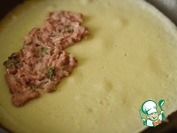 На разогретую сковороду налить тесто, когда блин поджарится с одной стороны, на половинку блина быстро выложить немного начинки. |