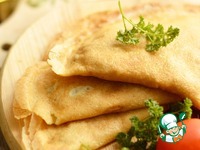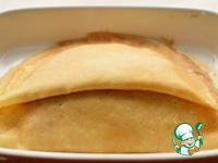 Аккуратно накрыть второй половинкой блина, прижать. Затем блин снять со сковороды и переложить в форму для выпечки. Каждый блин смазать растопленным сливочным маслом, чтобы они не слиплись. |