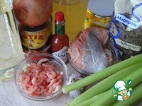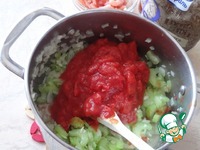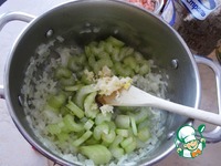 Добавьте порезанный сельдерей и раздавленный чеснок, табаско и обжаривайте еще несколько минут. |