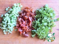 Салат тонко нарезать. Помидор и огурец нарезать кубиками. |