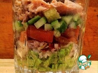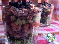 Выкладываем в порционные стаканы салат, рис, помидор, огурец и тунец. Сверху выкладываем тапенад. |