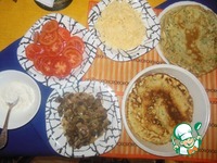Всё это посыпаем сыром и накрываем вторым блином. И так далее выкладываем начинку на наши блины. |