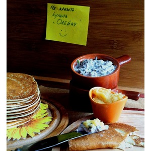 Описание: Очень нежные, тонкие блинчики с дипом из рикотты и щавеля. Особенно вкусно с подкопченной икрой мойвы.