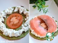 На блинчик выкладываем творожную начинку, ломтик помидора в середину и 2 кусочка рыбки |