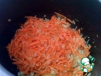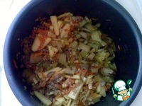 Добавляем к луку. Вообще все делаем последовательно, то есть пока режем одно, -другое жарится, но не забываем помешивать, ингредиенты не должны зажариваться, а просто термически обрабатываться |