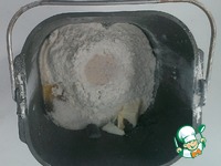 Сложить ингредиенты в ведерко хлебопечки. Я сначала добавляю жидкие ингредиенты, а потом сухие. Дрожжи высыпаю в углубление в муке. Выбираем режим "Стандартный", корочка - средняя. |