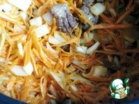 Добавить лук и морковь к мясу, перемешать, протушить 10 минут |