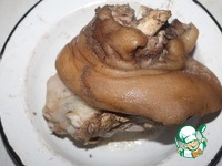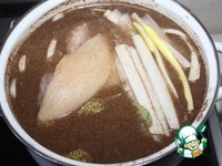 Вымоченную в воде рульку поместить в кастрюлю, залить водой, добавить лук, имбирь, вино, приправу "пять специй" (усяньмянь), лавровый лист. Варить 40-50 минут. |