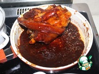 Добавить 3-4 половника бульона, в котором варилась рулька. Тушить 5-10 минут, все время поворачивая рульку, чтобы она покрывалась соусом с разных сторон. |