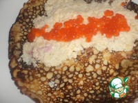 Свернуть блинчик рулетом, разрезать поперек на маленькие рулетики и вставить зубочистку - получатся канапе |