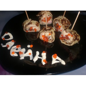 Описание: Канапе - удобная закуска для праздничного стола. Сделать их совсем несложно, особенно на масленицу, когда и блины готовы, и стол хочется разнообразить. Икра придает торжественности и красоты. Блюдо имеет два варианта - бюджетный с имитированным крабовым мясом и элитный - с настоящим. Икру тоже можно взять имитированную, тогда блюдо будет совсем недорогое.