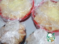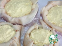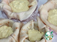 Выкладываем блинчики. Креманки должны быть небольшие, края блинчика должны свисать. Выкладываем немного начинки. |