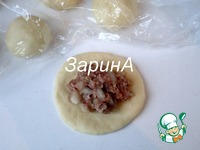 Из шариков сделать лепешечки, начинить их фаршем. |