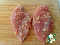 Филе помыть, обсушить бумажным полотенцем, слегка отбить и обмазать мелко рубленным чесноком, смешанным с солью. Оставить на 20 минут. |