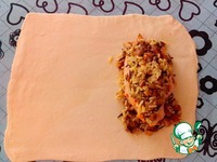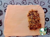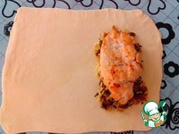 Тесто раскатать толщиной около 3 мм (у меня 2 пласта по 250 г). Выложить начинку по размеру филе. |