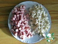 Тем временем, можно нарезать кубиками - сыр и ветчину. Смешивать их не нужно. |