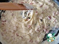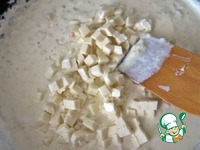 После растворения сыра, добавляем ветчину, мускатный орех, всё быстренько перемешиваем и солим по вкусу. Не забудьте посолить, начинка абсолютно пресная. |
