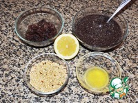 Орехи измельчить (не в пыль), с половинки лимона снять цедру мелкой теркой, выдавить сок. Изюм при необходимости замочить и порезать. Добавить все эти ингредиенты к маковой смеси. При желании влить в начинку 2-3 ложки ликера или коньяка.