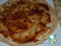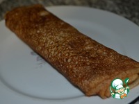 Закрутить в виде приплюснутого рулета. Смазать еще один блинчик, положить на него этот скрученный рулет и еще раз завернуть. Повторить тоже самое еще с одним блинчиком. |