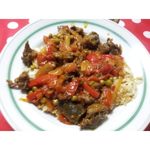 4. через 5 минут добавить столовую ложку горошка и пасту из перца, тщательно перемешать. через 2 минуты добавить кисло-сладкий соус и ранее приготовленное мясо, убавить огонь еще на одно деление и тушить под крышкой 10 минут. воду не добавлять. подливы получается достаточно.