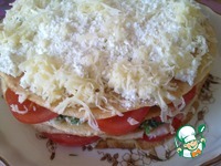 Укладываем ряды торта, пока не закончатся блины. Последний блин смазываем сырным кремом и посыпаем его сыром. Запечь при 175°С 20-25 минут, затем в режиме гриль — еще 2-3 минуты. |