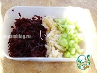 Свеклу и грушу натереть на терке, добавить тонко нарезанный черешок сельдерея |