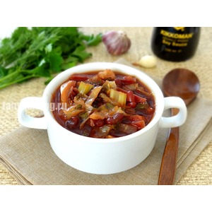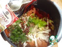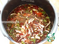 Свеклу, капусту, сельдерей нарезать крупной соломкой, помидор - полукругами; В чашу добавить остальную воду, выложить овощи, специи, шинкованную зелень. Добавить соевый соус и масло |