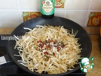 Капусту нашинковать, жарить на растительном масле с добавлением соевого соуса, специй до полуготовности. |