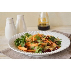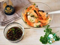 Кинзу моем и мелко рубим. Корень имбиря чистим и мелко натираем. Подмешиваем часть кинзы и имбирь к соусу и еще раз хорошо перемешиваем. Листики кинзы оставляем для украшения салата при подаче! |