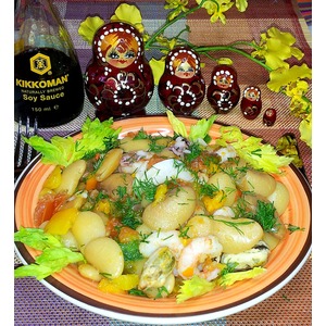 В конце приготовления фасоль должна быть мягкая. Добавить приправу и сухие травы, посолить и положить в фасоль морепродукты. Перемешать и выключить плиту. |