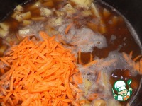 Следом чистим и натираем на терке морковь, добавляем ее в суп. |