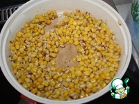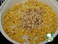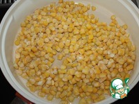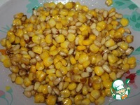 На сковороде разогреть масло, высыпать кукурузу. Кукуруза может быть вареная, счищенная с початка, консервированная или, как у меня, замороженная. Обжарить несколько минут. |