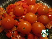 Помидорки помыть и отправить к перцу. Тушить без крышки несколько минут. |