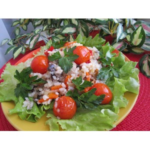 Рис положить к грибам, добавить 3 столовые ложки воды и немного потушить. Смешать содержимое обеих сковородок, посолить, поперчить, прогреть. ПРИЯТНОГО АППЕТИТА!!! |