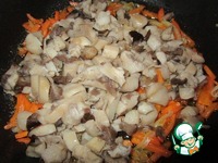 Добавить порезанные и отваренные грибы ( у меня подберезовики, замороженные с осени, но можно и вешенки ). Обжарить. |