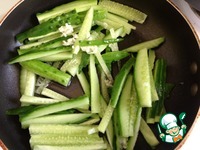 В раскаленную сковороду вылить масло и выложить огурцы, нарезанные тонкими брусочками. Чеснок пропустить через пресс, подсолить слегка |