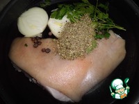Рульку заливаем на пару часов холодной водой. После чего чистим, моем и ставим вариться на 1,5 часа. Добавляем любые "специи" - лук, коренья, приправы. |