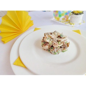 Добавляем в салат грибы (стоит их немного "отжать", удалив тем самым лишнюю жидкость), измельченные грецкие орехи и нарезанную петрушку. |