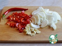 Порезать чеснок, лук, сладкий перец и перец чили. |
