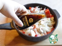 В сковороду налить оливковое масло, выложить подготовленные овощи и обжаривать с добавлением соевого соуса "Киккоман" в течении 5-7 минут. |