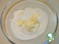 Для теста масло нарезать небольшими кусочками и порубить вместе с мукой в крошку. |