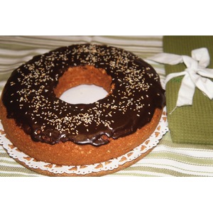 Форму смазать маслом, посыпать измельченными орехами. Тесто выложить в форму. У меня форма довольно большая, диаметр 25 см, поэтому кекс получился не очень высоким. |