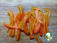 Болгарский перец так же нарезаем длинной, тонкой соломкой. |