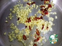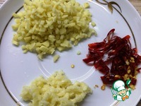 Чеснок измельчаем через пресс, имбирь нарезаем мелкими кубиками, по желанию можно натереть на терке. Перец чили измельчаем. У меня сухие стручки чили, так как свежий у нас сейчас совсем не острый |